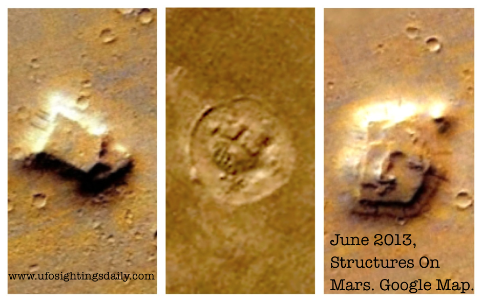 Three structures were discovered in Google map of Mars near "Amazonis Planitia" on June 18 2013, as reported by UFO Sightings Daily. The report was published on 19 June 2013. The website, UFO Sightings Daily, is coordinated by Scott C. Waring. He had been affiliated with the United States Air Force at SAC base (USAF flight line). He currently owns an ESL School in Taiwan.