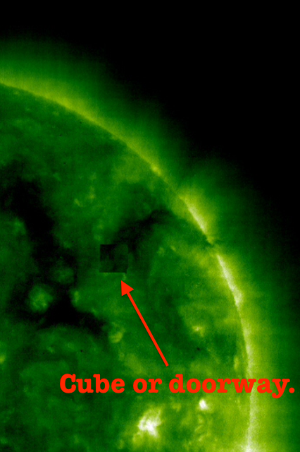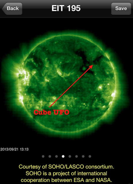 I was looking at my app on my iPhone and came across this cube UFO or doorway within the sun. I use the official NASA SOHO app as to get it directly from an official source. Within todays sun photos was the cube -- black this time and it looks like it is submerged in the sun.