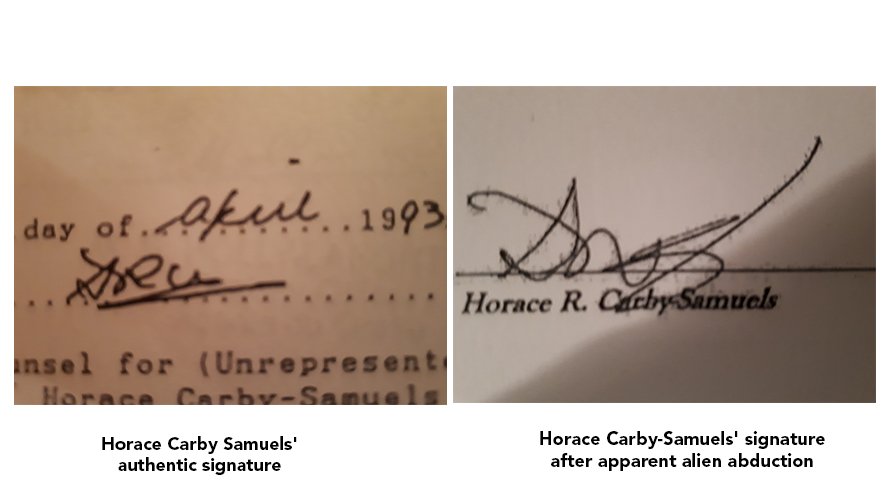 In the image on the left, you will see the signature that Horace has had for over 60 years. To the right, you will then see the signature of the being occupying Horace's body. Multiple handwriting experts have asserted there is no way the two signatures could have been written by the same person.