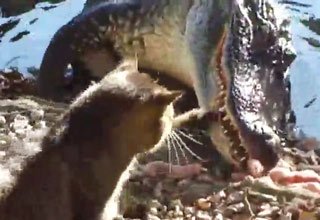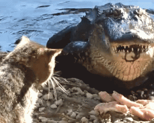 A bunch of tourist enjoying themselves on the Cajun Pride Swamp Tours in LaPlace, Louisiana happened upon a battle of the centuries. It’s an epic deathmatch for the ages. This feisty cat squares off with a hungry alligator over some pieces of chicken. Who will win? More importantly, who sits around and laughs as their cat swats at an alligator? Get the cat out of there! A bunch of tourist enjoying themselves on the Cajun Pride Swamp Tours in LaPlace, Louisiana happened upon a battle of the centuries. Internet site reference: http://www.blippitt.com