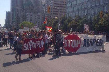 A banner reading “Stop [Prime Minister Stephen] Harper†was at the forefront of the march as the crowd chanted anti-Harper slogans such as “Throw him in jail, with no bail.â€