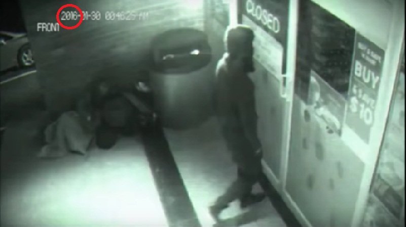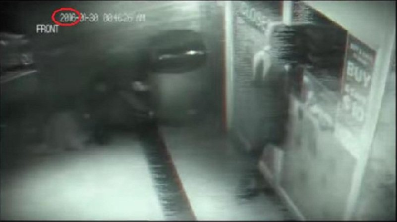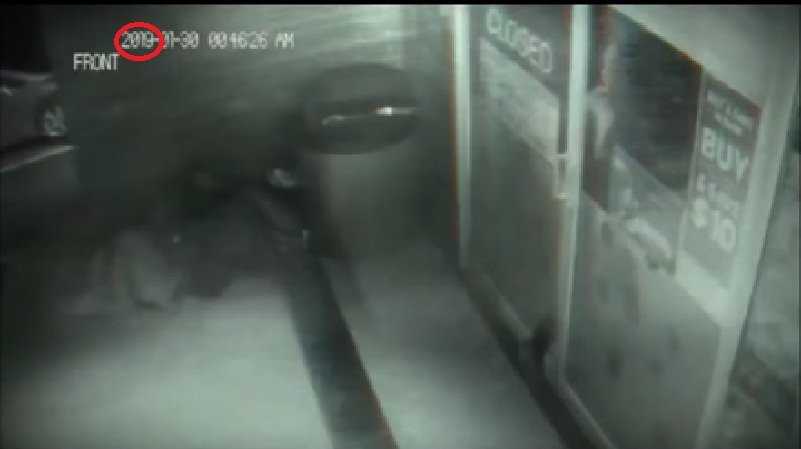This is an interesting video. A person walks through a closed door into a shop. The shop lights flicker on for a few seconds, then off again. He/she soon walks out eating something like a sandwich. Also the date and time flickers on the video. It changes from 2016 to 2019. Very strange like the person had a time energy vortex around them that effected the date on the video.
