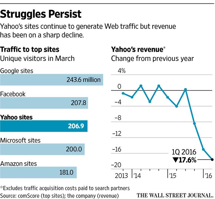 Yahoo's recent financial performance is unlikely to drive the bidding upward. In the most telling sign of the company's deterioration, Yahoo's net revenue - after subtracting ad commissions - fell from slightly from more than $1 billion a year ago to $842 million in the latest quarter. That's the steepest decline yet under Mayer.