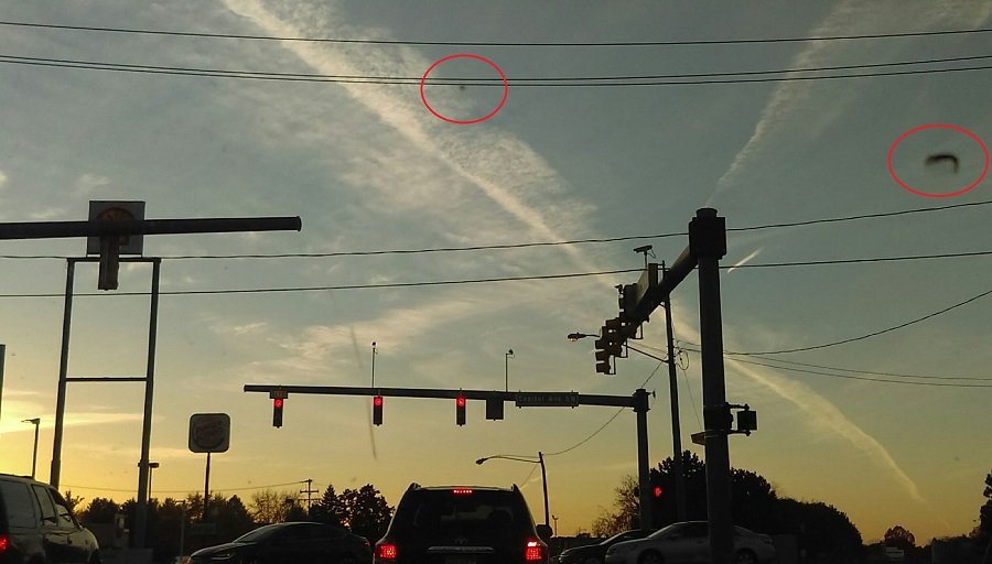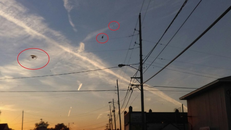 According to an anonymous report published on famous UFO specialised website MUFON.com, a local resident affirmed to have spotted a series of objects hovering around some long-lasting trails in the sky (traditionally called chemtrails).