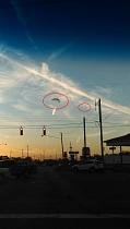A dear friend of mine had taken some pictures while driving. Earlier that day they had not been spraying chemtrails and thought maybe they would lay off for a day. She took these driving on the south side of the city when she got to stop at a light. When she got home she discovered something strange in the pictures and just had to show me. So not only did I get to see more pictures of chemtrails but something definitely in them. She forwarded the pictures to me 14 November. Whatever they are they are affecting the chemtrails and light around them. With Military bases in the area, it could also be related to them in some way? I've shown these to other friends and they said it should be reported. To me it appears like a plasma entity that the chemtrails exposed. The ripples in the chemtrails demonstrate that some frequency device was used to induce them. Whatever this entity is it is unusual. It does resemble some orbs, but bigger than any I have ever seen in pictures.