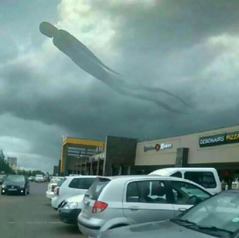 “A bizarre human-like figure appears to have been spotted in the clouds above a shopping centreâ€, stated The Sun. “Images circulated on social media show the huge shape, which bears a resemblance to the evil ‘dementors’ in the Harry Potter series†it continued.