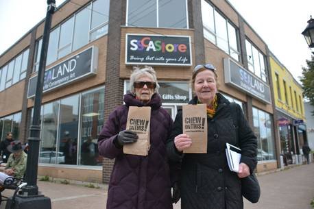 The activists were distributing paper bags with the words “Chew on this!†written on them. According to the activist website, “chew on this is a national campaign to raise awareness of food insecurity, and call for the implementation of an effective and comprehensive national anti-poverty plan to address the systemic issues poverty in Canada. Thousands of Canadians are demanding the federal government build on the first federal poverty reduction plan to eradicate poverty and hunger for the nearly 900,000 people in Canada who use food banks each month and for the millions of others struggling to get by. The Canadian Poverty Reduction Strategy is the first step – but we need a plan that can end poverty in Canada.â€
