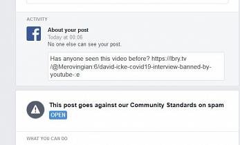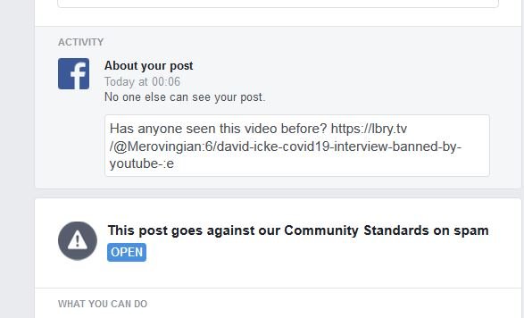 When I sought to post the above video to Facebook I was blocked by their apparent "New World Order" censor board which is seeking to repress an apparent plot to repress your freedoms under a "pandemic" orchestrated by what David Icke describes as psychopaths.
