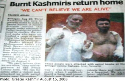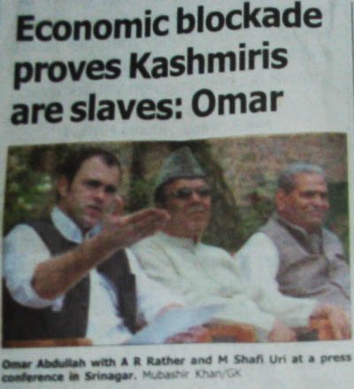 The truck drivers in the picture carrying essential supplies from India to Kashmir were stopped, their vehicles set on fire and poor drivers sustained burn injuries and were lucky that they survived to return home. Installed Chief Minister Omar Abdullah termed the action as “economic blockade that proved Kashmiris to be slavesâ€.