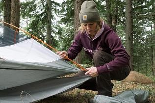 Next, lay a ground cloth over your campsite, open your tent and begin inserting the poles into the frame. Now it’s time to raise the tent. Once you’ve hammered in the tent pegs, set up the rainfly and you’re ready to move in! An old area rug is a great base layer inside the tent. It’ll catch dirt particles, and it’s super comfortable under tired feet.
