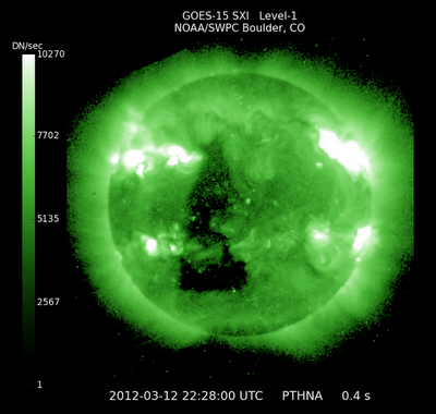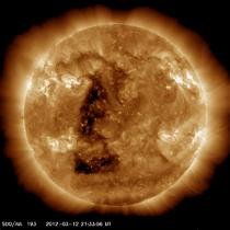Date of sighting: March 12, 2012 "I honestly don't know if I should post this in Space Exploration, Paranormal Phenomena, Aliens and UFOs or Global Meltdown topics. I'm baffled jaw-dropped and astonished. Videos and images showing a monster coronal hole in the Sun, with the perfect shape of a triangle, were uploaded on NASA SDO website. It's definitely NO glitch. It's a PERFECT triangle-shaped coronal hole, it's appearing in all spectrum of graphics and images and it must be VERY important because NASA highlighted it."