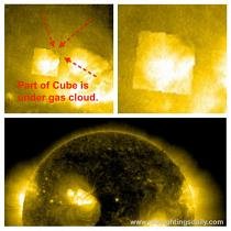 Waring begins his latest post, “I was looking at some sun images by NASA/SOHO when I saw the cube again. I say cube because a few times I have reported it while it was clearly visible as a 3d object. This time however what interests me the most is that this time it has one corner that has a gas cloud covering it.â€