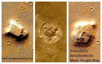 Three structures were discovered in Google map of Mars near "Amazonis Planitia" on June 18 2013, as reported by UFO Sightings Daily. The report was published on 19 June 2013. The website, UFO Sightings Daily, is coordinated by Scott C. Waring. He had been affiliated with the United States Air Force at SAC base (USAF flight line). He currently owns an ESL School in Taiwan.